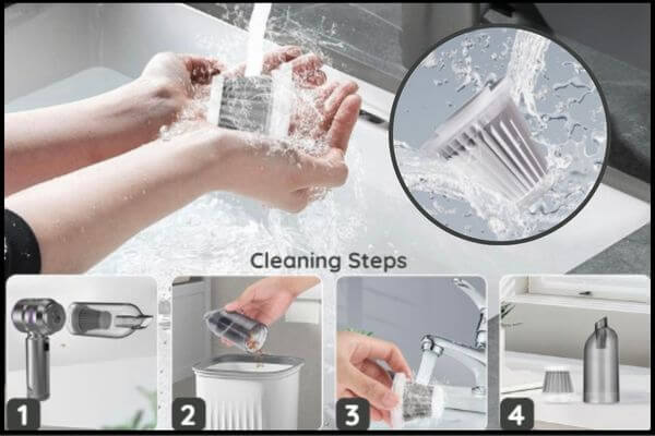2. Wash the Vac Cup and HEPA under running water for a thorough clean. (If cleaning is difficult, use warm water and a small amount of detergent to assist.)